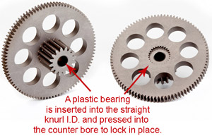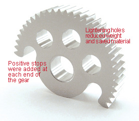 The Powder Metal Process Makes Manufacturing a Cluster Gear EconomicalThe Challenge: A customer manufacturing a control mechanism required a metal cluster gear that would combine a gear with a pinion gear. The manufacturer wanted to be able to insert a plastic bearing into the I.D. and lock it in place. The Solution: Perry Tool was able to manufacture the cluster gear so that the plastic bearing component could be inserted into the straight knurl I.D. A counter bore was designed into the gear so that the plastic bearing could be pressed into the gear to lock it in place. The gear was manufactured to an 8 AGMA Quality Class and a maximum concentricity of .0020. It was oil impregnated to perform as a self lubricated gear. The Results: Perry Tool & Research was able to tool and manufacture this cluster gear in very high volumes as a compact powder metal component without any secondary operations. The original manufacturing process would have required several machining processes: manufacturing the gear and pinion gear, counterboring, undercutting for chip relief, and broaching a straight knurl. Other creative process may have been employed but all would have required several costly secondary operations. In addition, eight lightening holes were added to save material and shipping weight, resulting in a reduction of the overall manufacturing cost. |