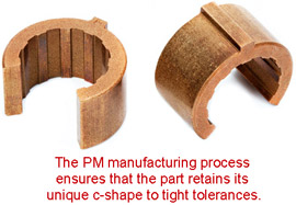 Powder Metal the Process of Choice -- Manufacturing a Linear Carriage BushingThe Challenge: As a component of a print head for a 36” engineering printer/scanner/copier used to produce large 36” x 52” documents, this part needed to travel linearly in a traverse motion up to 36 inches with minimal friction. The unique c-shape of the part also required a manufacturing process that would ensure the part retained its shape to tight tolerances. The Solution: Using the PM process, Perry Tool was successful in producing a porous, oil-impregnated bronze bushing holding the tolerances to 50% of the call-out, #4 surface finish on the I.D. and zero spring back at the opening of the c-shape. No secondary machining operations were required. The bushing was designed with a splined I.D. and O.D. tolerances of +/- .0005 and a concentricity of .0015. To reduce friction and extend the life of the part, it was specified that the part be oil impregnated. The Results: The versatility of the PM process gave the customer a part manufactured to their exact design specifications. The nature of powder metal compacting made manufacturing this linear carriage bushing to tight tolerances with minimal friction possible. With other manufacturing processes, the metal used retains its memory even after the manufacturing process making the production of a c-shaped part that requires tight tolerances difficult to achieve. This is not the case with powder metal. It has no intrinsic memory making it easy to produce unusual shapes. |