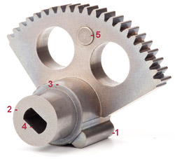 A Multi-level Part is Economical to Produce Using PMThe Challenge: The customer required a segment gear that combined several features into a single part. The goal was to reduce assembly costs and the need for any secondary machining. The Solution: Using the PM compacting process, Perry Tool was able to produce this complex segment gear designed by the customer. On the hub there is a lobe (1) to interface the mechanical portion of this gear with an electrical interface via a limit switch. Both ends of the hub are reduced in diameter (2) to provide a bearing (3) (oil impregnated) to support the torque of the gear. The hub also contains a double D hole (4) for driving the shaft that this gear is attached to (a very difficult hole to machine). There is a 3/16” stop pin on the face of the gear (5); the costumer required a hard pin for this stop with a specific radius on the end of the pin, this required a non standard pin and was going to be expensive. We did a cost analysis and found that we could produce a PM pin from a sinter hardening material to the tolerances required at much less cost than a custom ground pin. The Results: The end result was that the customer received everything they wanted in a part from one source. All they need to do is drop the part in place. The Powder Metal Process gave the customer the flexibility to produce to their exact design specifications. |