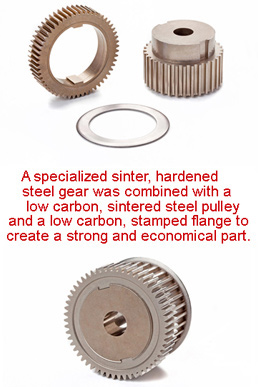 Combining a Pulley and a Gear in One Economical PartThe Challenge: A manufacturer of copy machines required a gear assembly that maintained close tolerances and had a specific strength capability. The assembly needed to be produced economically for the anticipated annual production quantities. The Solution: Perry Tool & Research, Inc. combined a specialized sinter, hardened gear with a low carbon, sintered steel pulley and a flat steel flange to create a strong and economical part. A keyway interface is designed to press-fit the gear and pulley components into one assembly, and then the gear and flange are staked on the pulley to complete the assembly. Tolerances are maintained as close as 0.002 in (0.05mm), eliminating the need for finish machining operations on the gear profiles and assembly. The Results: The powder metal gear assembly met all of the customer's performance requirements at a lower cost than machining the part from steel. In addition, the quality, reliability, and finish are more consistent using the powder metal process then when machined. |